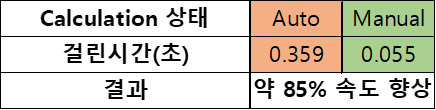 (예시) C열에 A열 값 + B열 값 함수가 작성되어 있고 행1~1,000번째 열 1~2번째 값을 변경하였을 때 자동/수동 계산 여부에 따라 약 85% 속도 향상