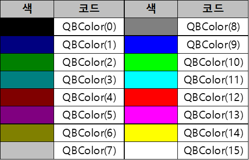 QBColor함수는 0~15로 지정된 16개의 숫자 인덱스로 색상을 변경합니다.