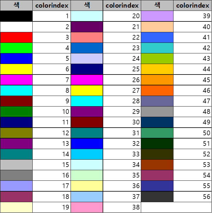 ColorIndex 속성은 1~56까지 색이 미리 지정되어 필요한 인덱스 숫자로 색상을 지정합니다.