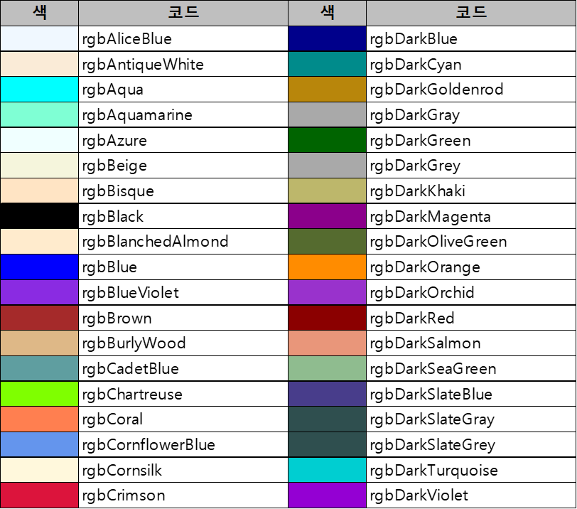 VBA에서 내장 상수로 저장된 142가지 색상은 아래와 같습니다.