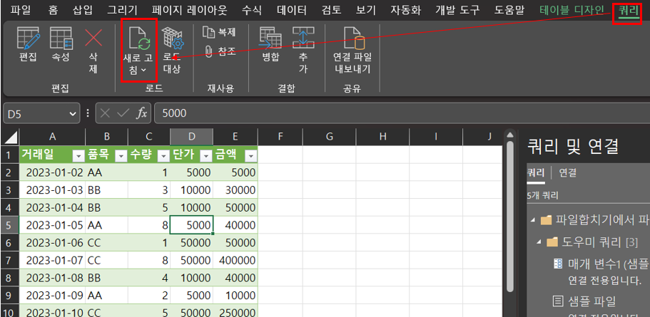 : 기존에 병합했던 파일을 열어 쿼리를 선택 후 [새고고침]을 클릭합니다.