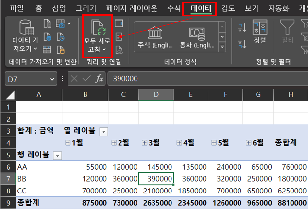 : 보통은 원본을 수정해줘야 하지만 피벗 생성 시 쿼리 테이블을 원본으로 하고 있어, 쿼리가 업데이트되면 피벗 원본도 동시에 바뀌기 때문에 [모두 새로고침]을 통해 쿼리와 피벗을 업데이트할 수 있습니다.