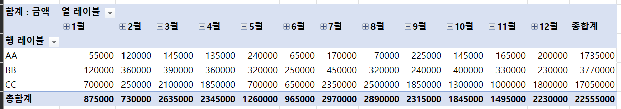 : 편이상 월별 품목별 금액 추이를 보기 위해 아래와 같이 세팅하였습니다.