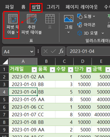 : 쿼리 테이블 선택 후 피벗 테이블 생성하기