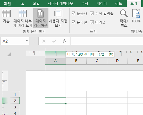 3개의 보기 옵션 중 [페이지 레이아웃] 보기인 경우에만 행높이과 열 너비가 cm(센티미터)로 표시됩니다.