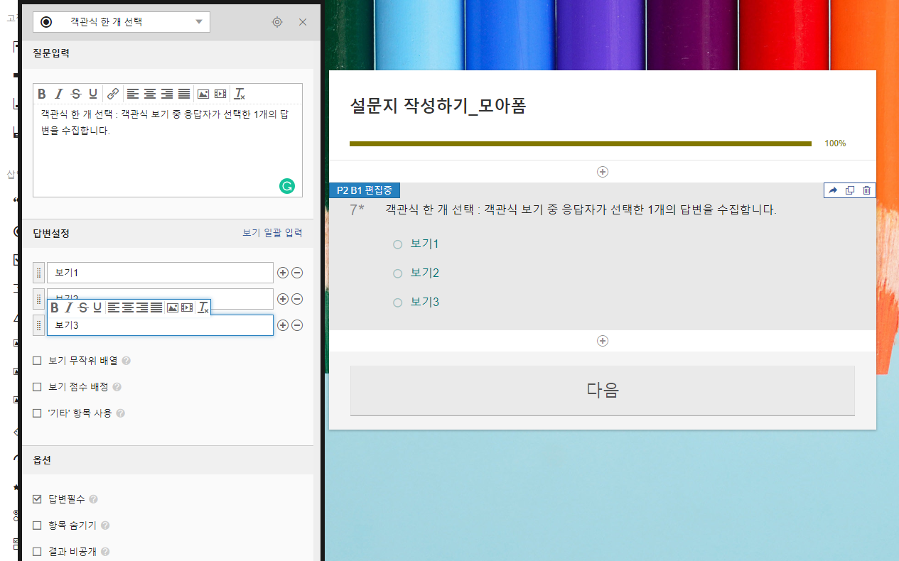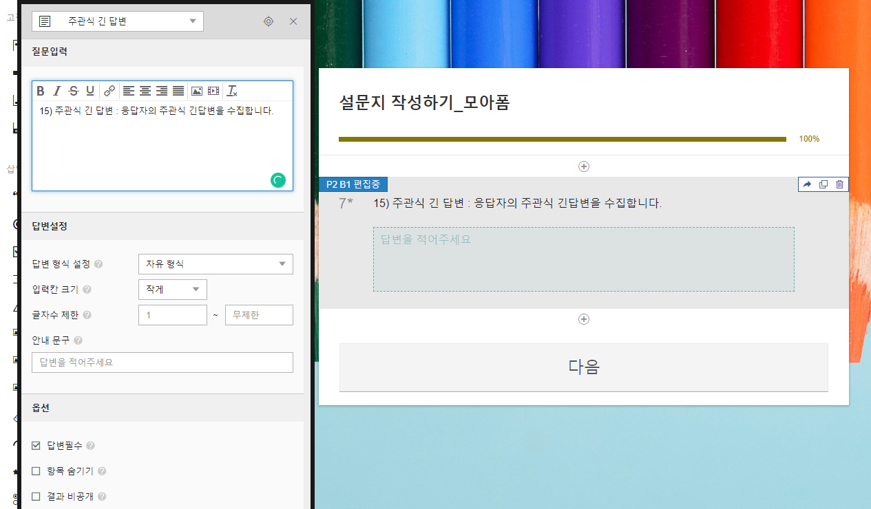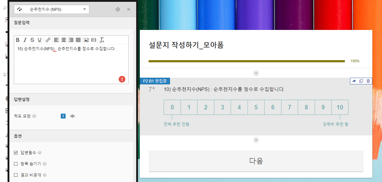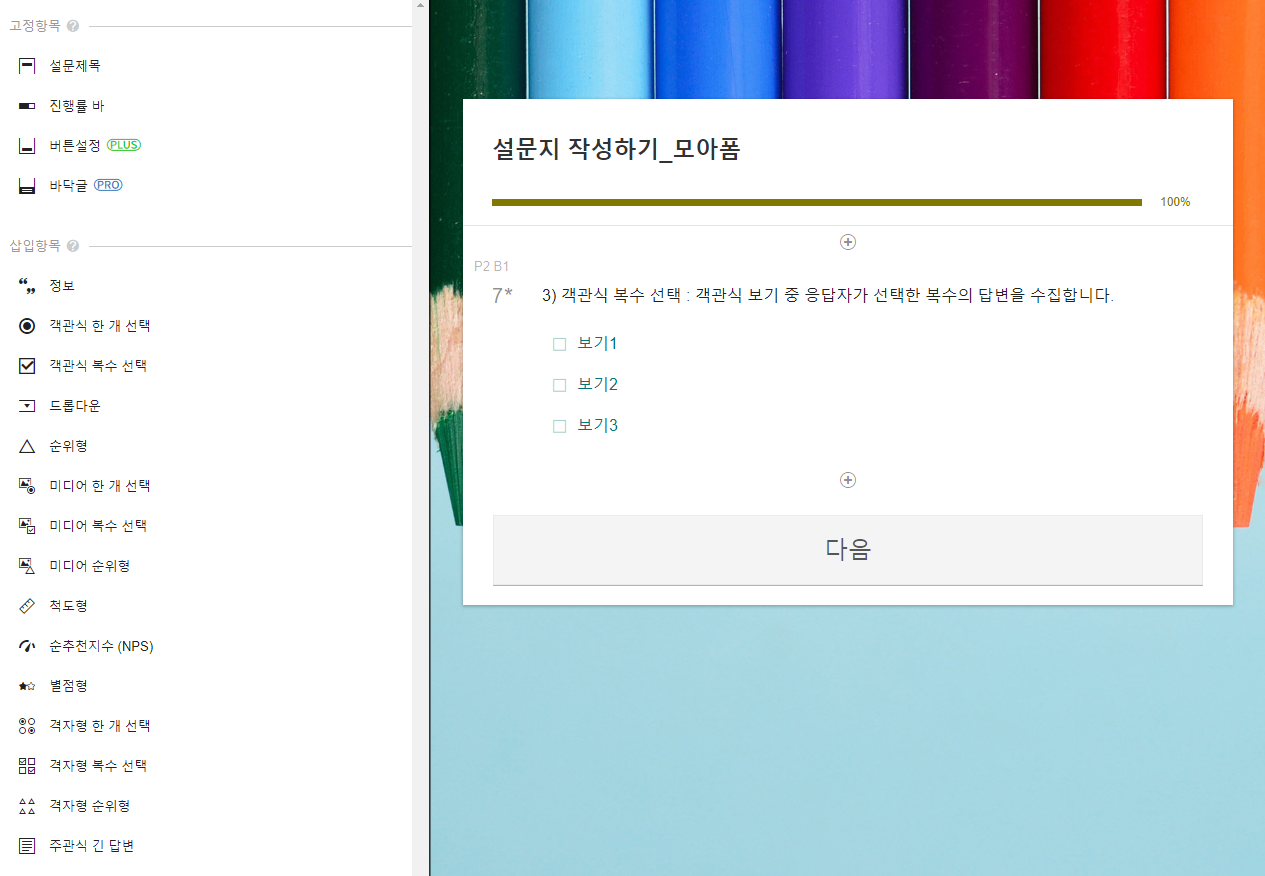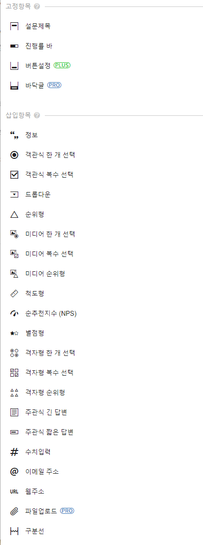 설문 작성자가 설문지를 직관적으로 만들 수 있도록 잘 구성되어 있으며