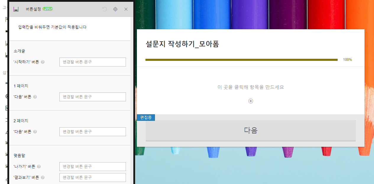 3) 버튼 설정 : 설문지 내에서 사용하는 버튼 문구를 변경합니다(PLUS 서비스 가입 시 사용 가능)