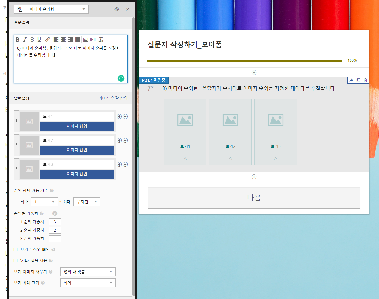 8) 미디어 순위형 : 응답자가 순서대로 이미지 순위를 지정한 데이터를 수집합니다.