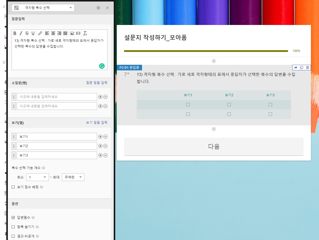 13) 격자형 복수 선택 : 가로 세로 격자형태의 표에서 응답자가 선택한 복수의 답변을 수집합니다.