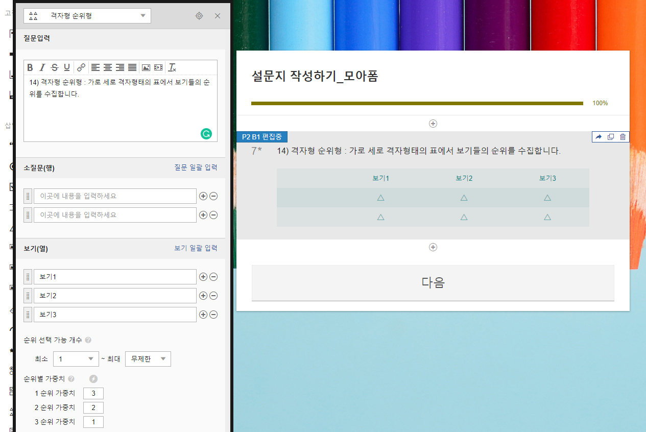 14) 격자형 순위형 : 가로 세로 격자형태의 표에서 보기들의 순위를 수집합니다.