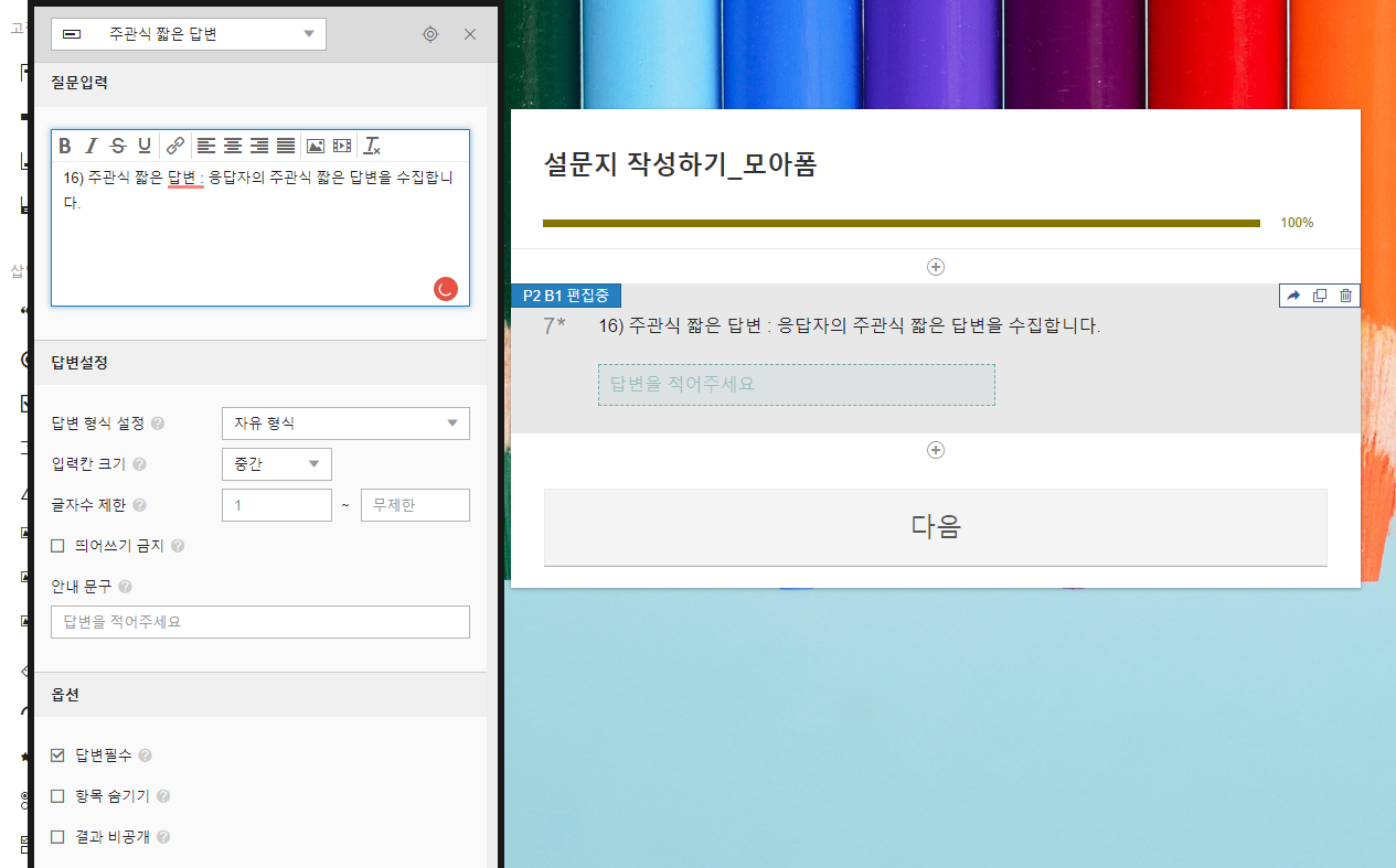16) 주관식 짧은 답변 : 응답자의 주관식 짧은 답변을 수집합니다.
