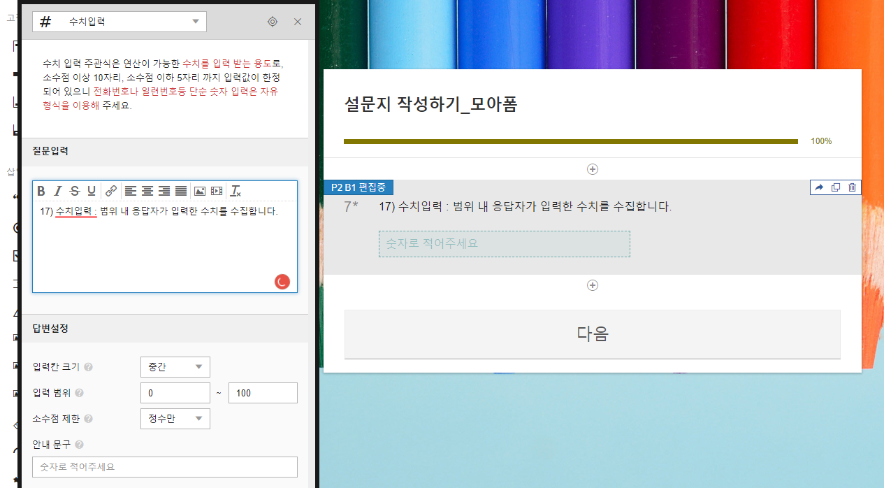 17) 수치 입력 : 범위 내 응답자가 입력한 수치를 수집합니다.