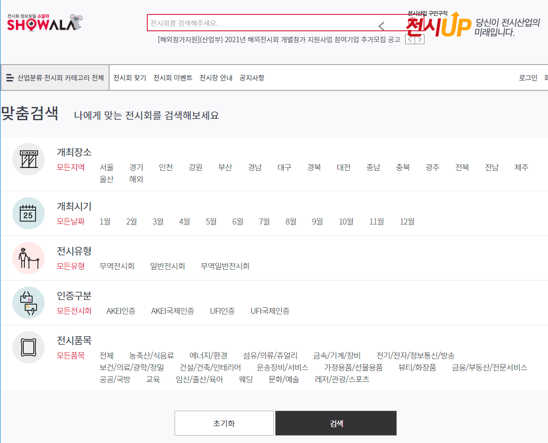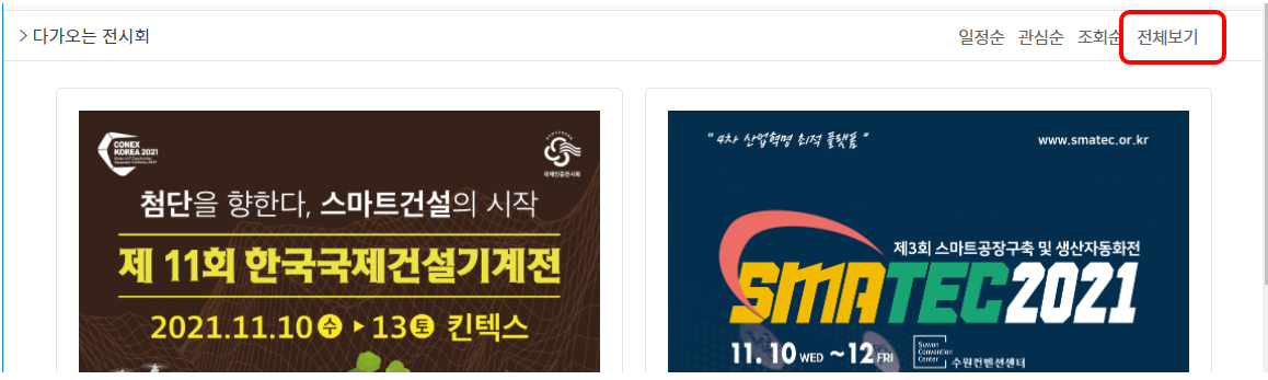 - 전시회 전체보기 클릭 후, 장소/시기/유형/인증/품목별 상세하게 조회 가능