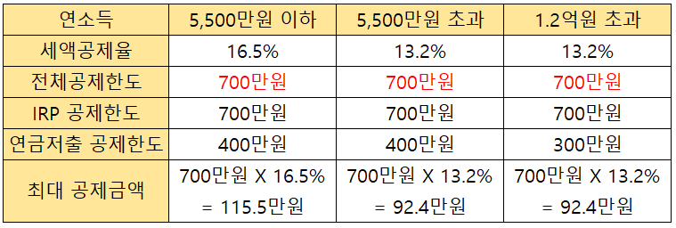 (단, 연금저축에 가입한 경우, 연금저축(최대 400만 원 한도)을 합산하여 총 700만원 세액공제)